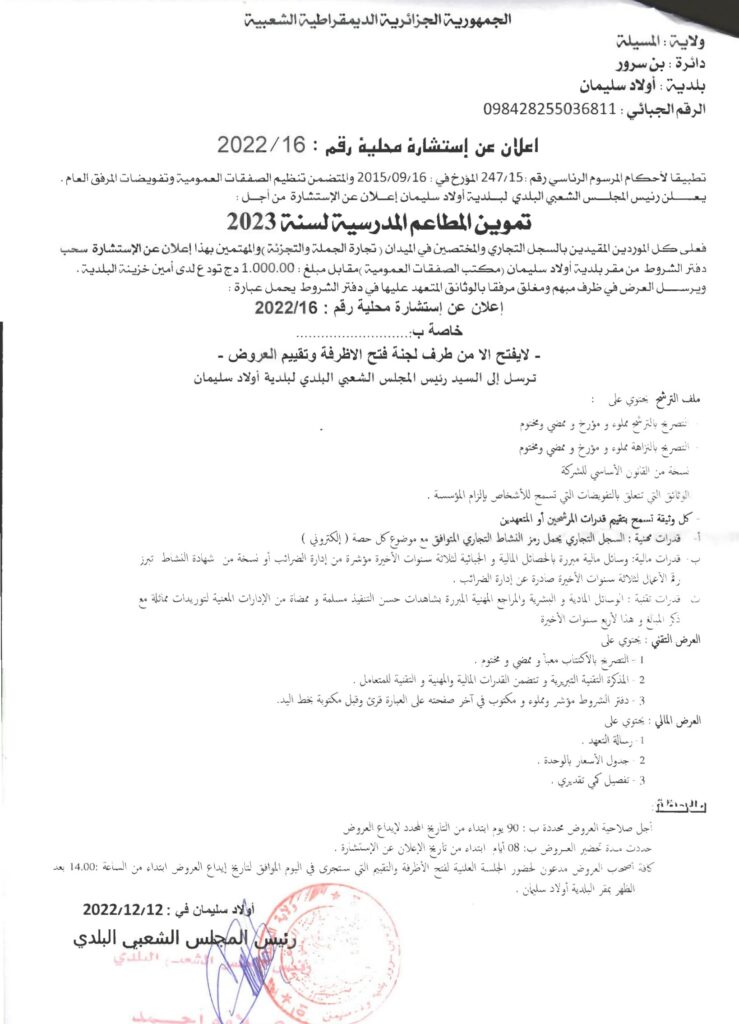 الاستشارة من أجل: تموين المطاعم المدرسية لسنة 202313 ديسمبر، 20220 26 شاركها فيسبوك X مشاركة عبر البريد طباعة