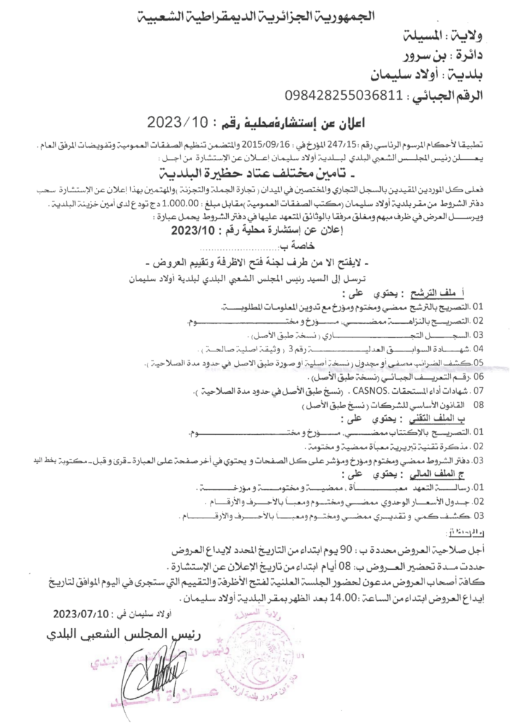 استشارة من أجل: تأمين مختلف عتاد حظيرة البلدية11 يوليو، 20230 14 شاركها فيسبوك X مشاركة عبر البريد طباعة