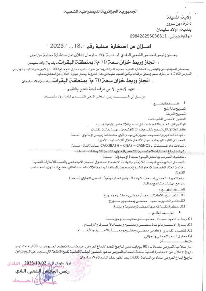 استشارة من أجل: انجاز وربط خزان سعة 70 م3 بمنطقة البقرات4 أكتوبر، 20230 5 شاركها فيسبوك X مشاركة عبر البريد طباعة
