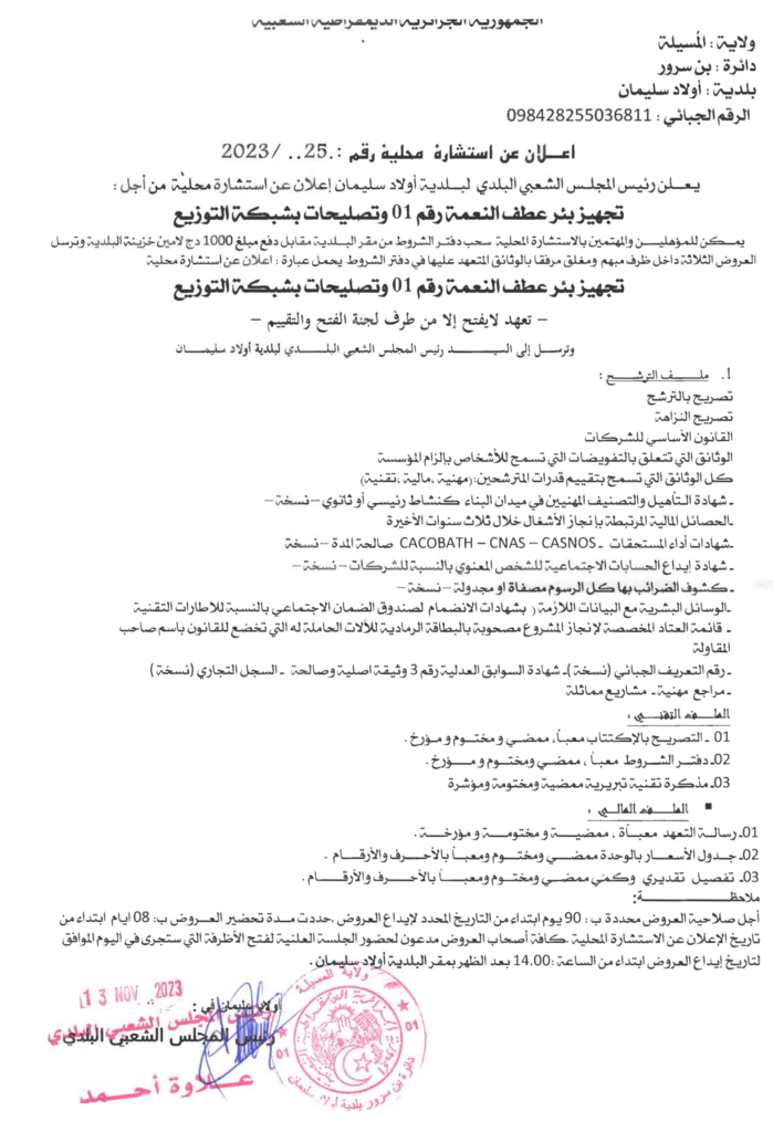 استشارة من أجل: تجهيز بئر عطف النعمة رقم 01 وتصليحات بشبكة التوزيع16 نوفمبر، 20230 8 شاركها فيسبوك X مشاركة عبر البريد طباعة