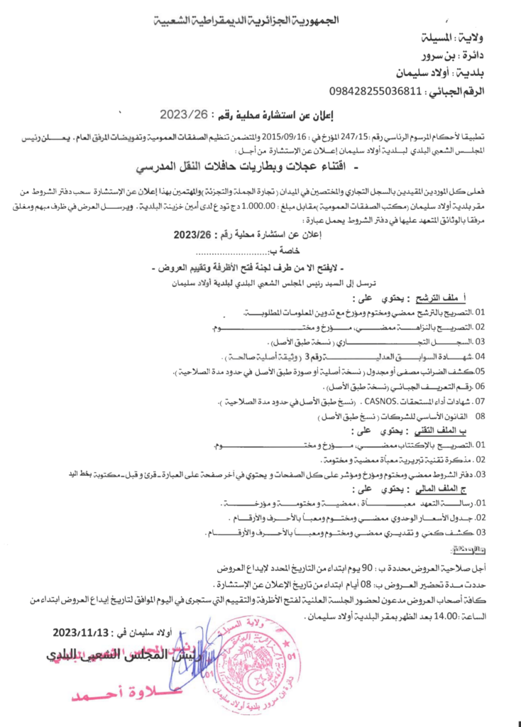 استشارة من أجل: اقتناء عجلات وبطاريات حافلات النقل المدرسي16 نوفمبر، 20230 1 شاركها فيسبوك X مشاركة عبر البريد طباعة