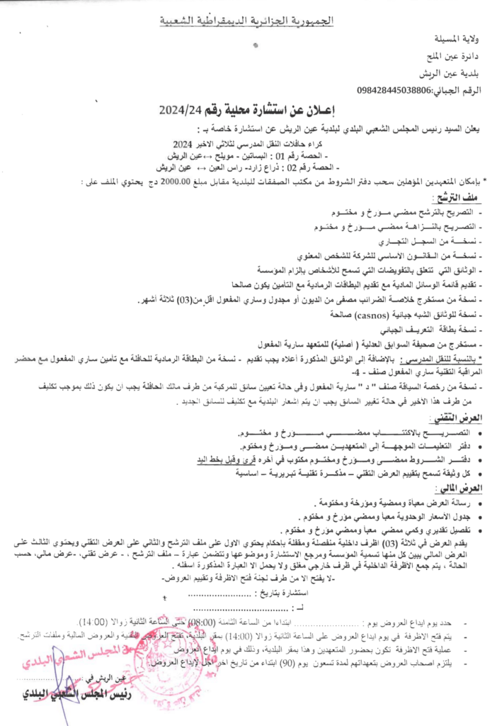 استشارة من أجل: كراء حافلات النقل المدرسي لثلاثي الأخير 2024 لبلدية عين الريش20 نوفمبر، 20240 8 شاركها فيسبوك X مشاركة عبر البريد طباعة