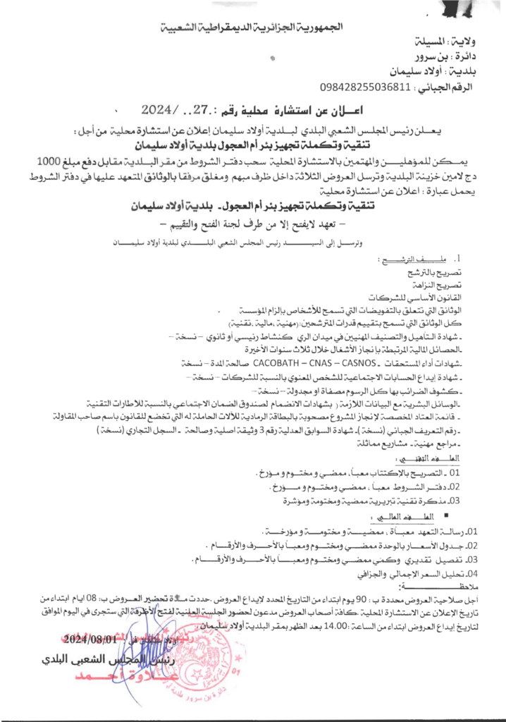 استشارة محلية من أجل: تنقية وتكملة تجهيز بئر أم العجول7 أغسطس، 20240 16 شاركها فيسبوك X مشاركة عبر البريد طباعة