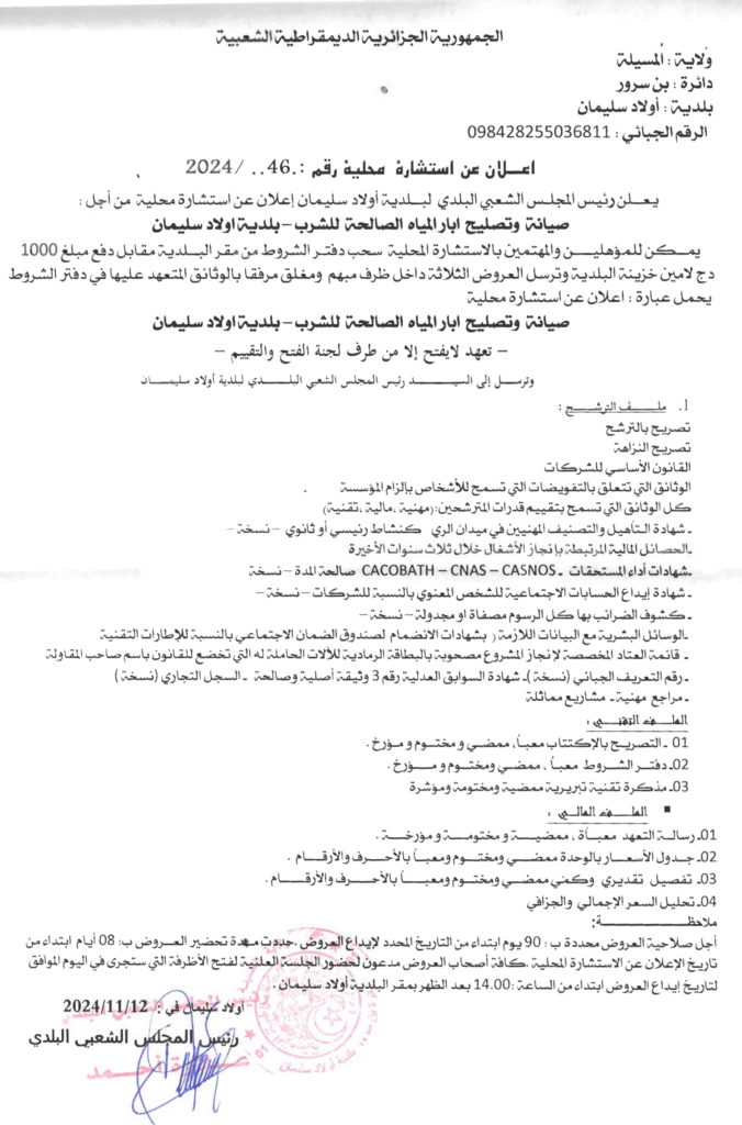 استشارة من أجل: صيانة وتصليح آبار المياه الصالحة للشرب – بلدية أولاد سليمان14 نوفمبر، 20240 0 شاركها فيسبوك X مشاركة عبر البريد طباعة