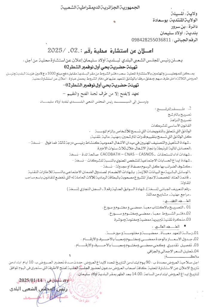 استشارة من أجل: تهيئة حضرية بحي أول نوفمبر الشطر 0216 يناير، 20250 30 شاركها فيسبوك X مشاركة عبر البريد طباعة