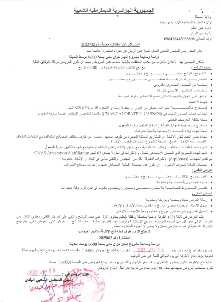 إعلان عن استشارة محلية 2025/02 بلدية عين الريش