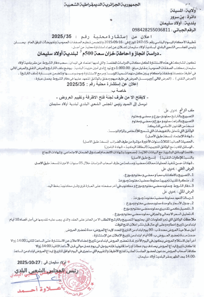 إعلان عن استشارة محلية 2025/35 بلدية أولاد سليمان
