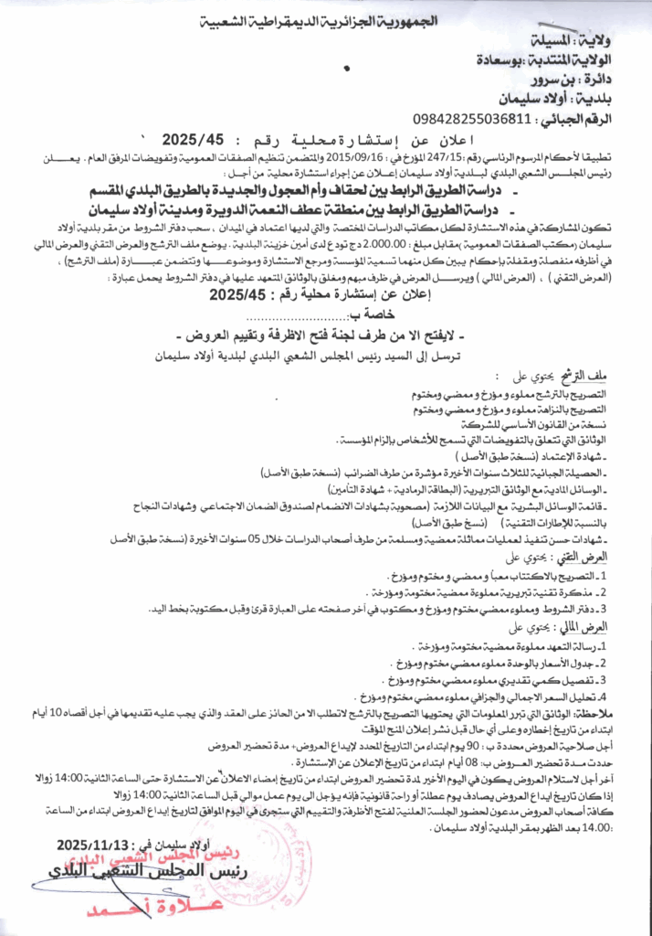 إعلان عن استشارة محلية 2025/45 أولاد سليمان