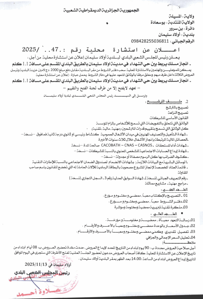 إعلان عن استشارة محلية 2025/47 أولاد سليمان