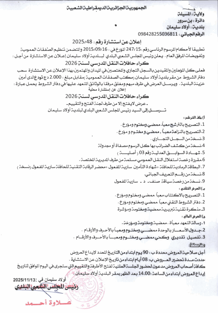 إعلان عن استشارة محلية 2025/48 أولاد سليمان
