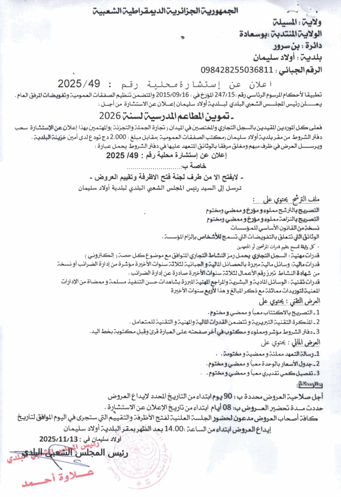 إعلان عن استشارة محلية 2025/49 أولاد سليمان