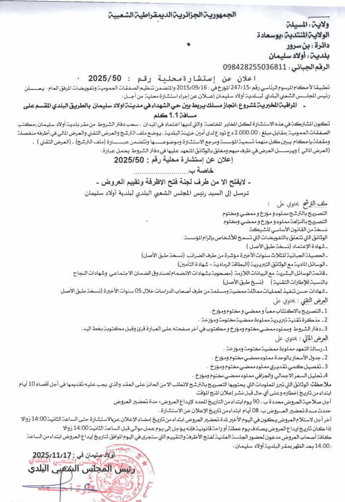 إعلان عن استشارة محلية 2025/50 بلدية أولاد سليمان