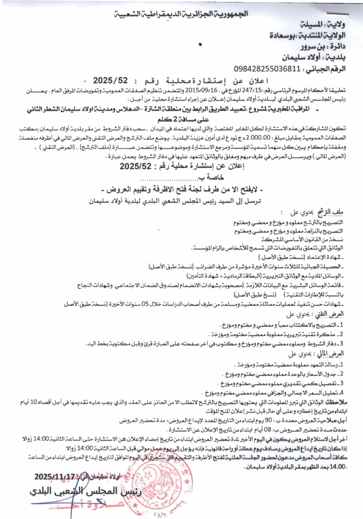 إعلان عن استشارة محلية 2025/52 بلدية أولاد سليمان