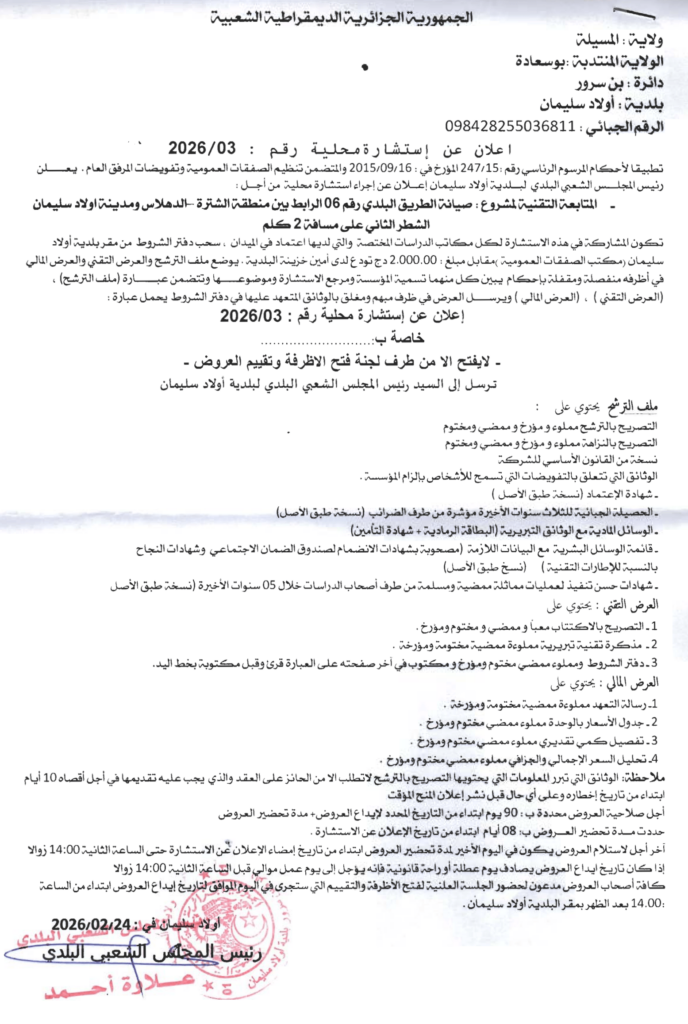 إعلان عن استشارة محلية 2026/03 بلدية أولاد منصور