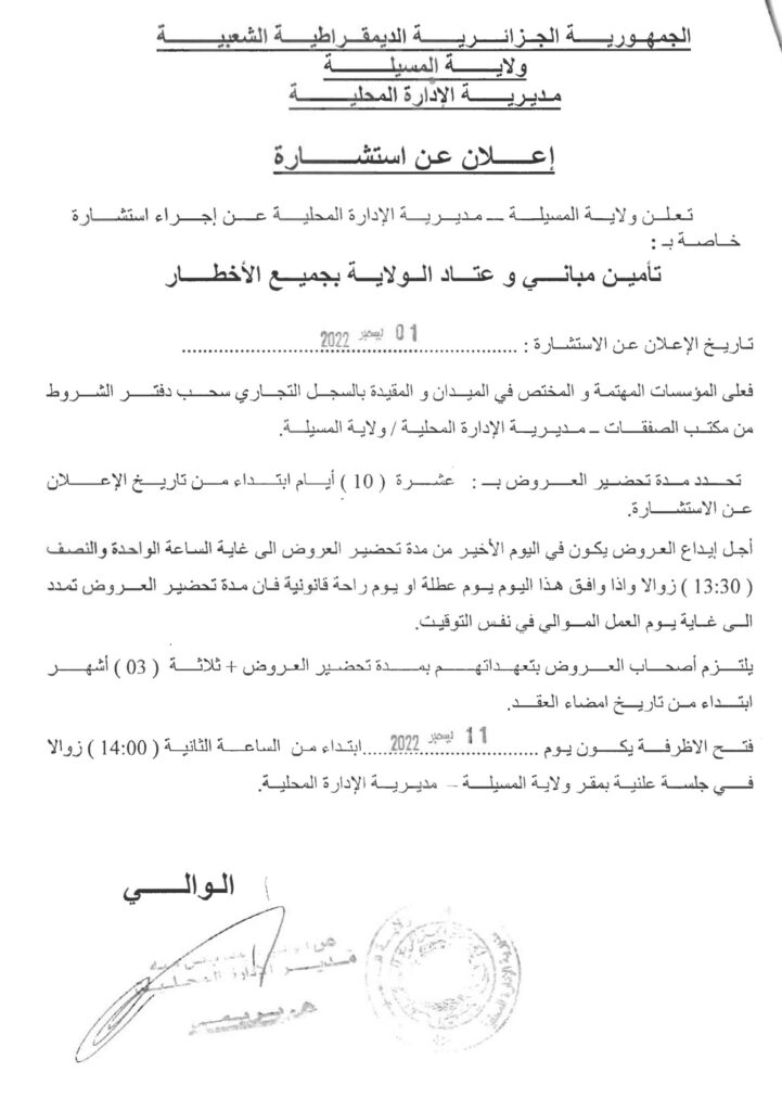 إعلان عن استشارة خاصة بــ : تأمين مباني وعتاد الولاية بجميع الأخطار/ مديرية الإدارة المحلية