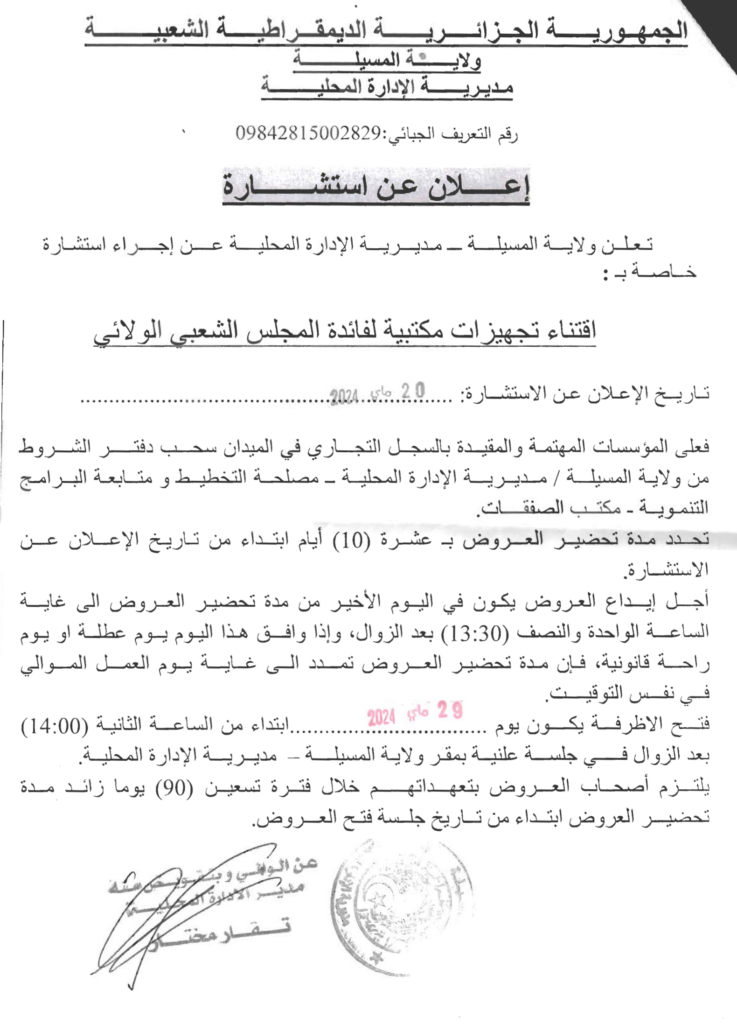 استشارة من أجل: اقتناء تجهيزات مكتبية لفائدة المجلس الشعبي الولائي22 مايو، 20240 16 شاركها فيسبوك X مشاركة عبر البريد طباعة