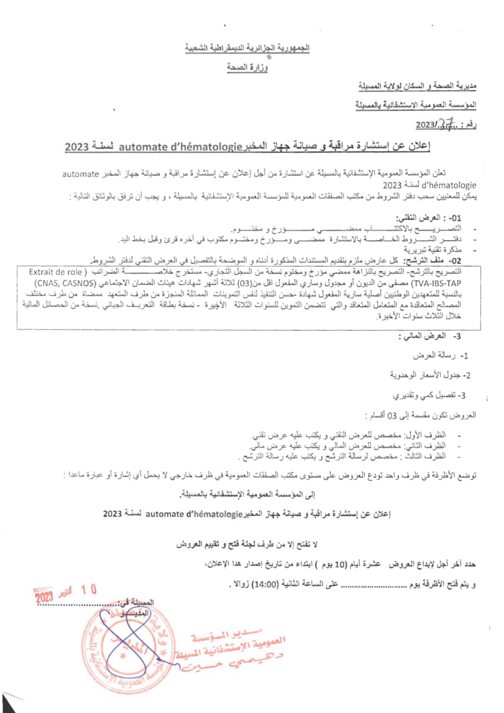 إعلان عن استشارة مراقبة وصيانة جهاز Automate d’hématologie لسنة 2023/ المؤسسة العمومية الاستشفائية بالمسيلة