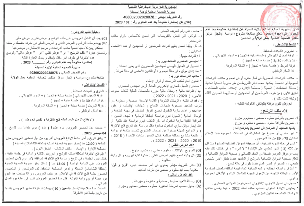 استشارة من أجل: دراسة وانجاز مركز متقدم للحماية المدنية بمقر الولاية5 ديسمبر، 20230 57 شاركها فيسبوك X مشاركة عبر البريد طباعة