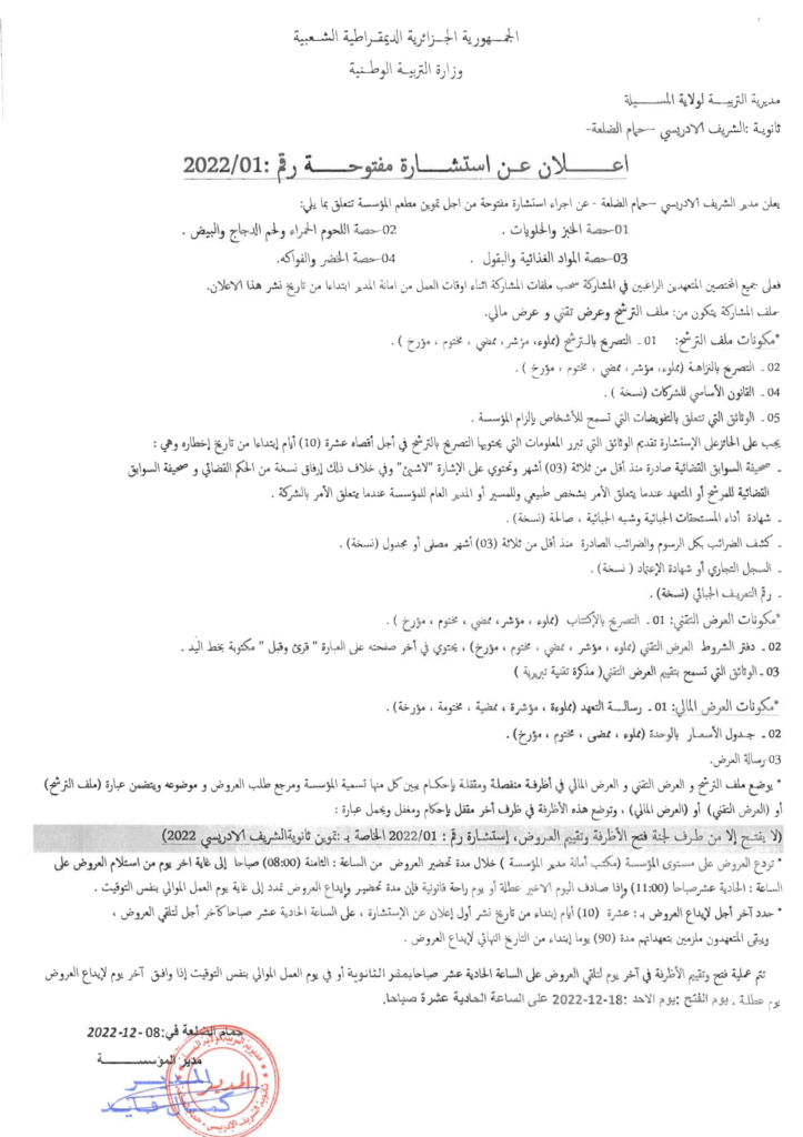 إجراء استشارة مفتوحة من أجل تموين مطعم المؤسسة تتعلق بما يلي:حصة الخبز والحلوياتحصة اللحوم الحمراء ولحم الدجاج والبيضحصة المواد الغذائية والبقولحصة الخضر والفواكه11 ديسمبر، 20220 26 شاركها فيسبوك X مشاركة عبر البريد طباعة