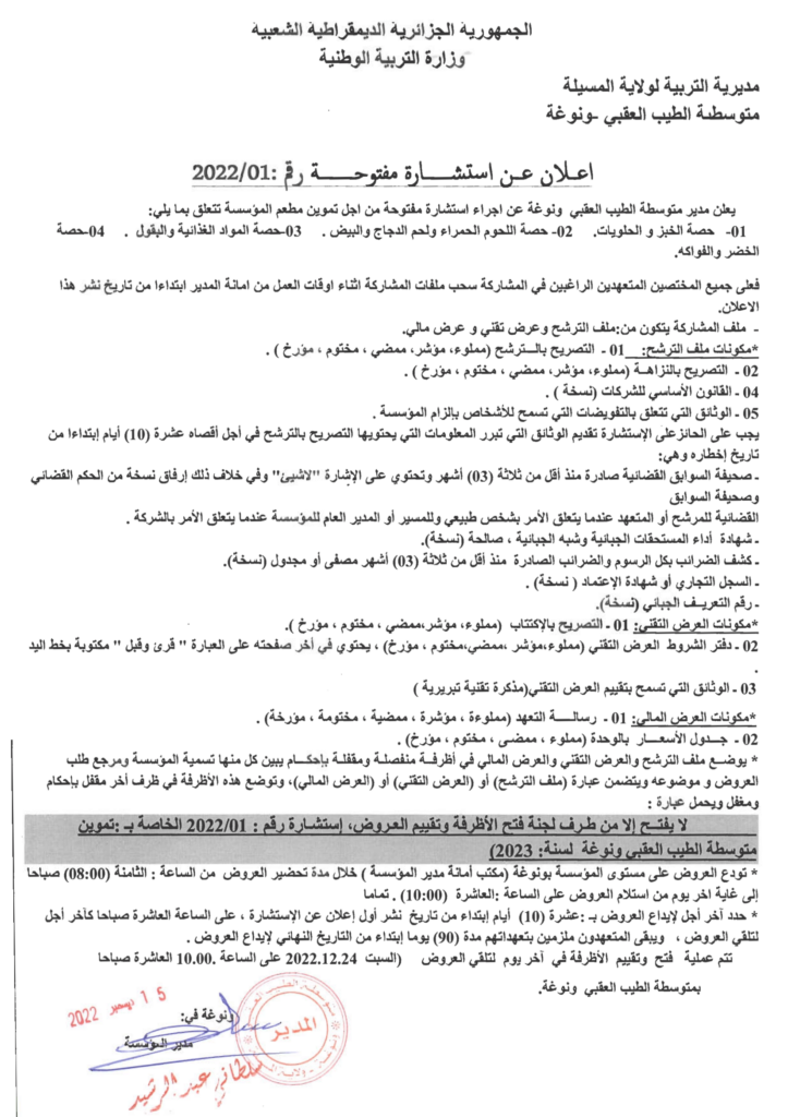استشارة مفتوحة من أجل تموين مطعم متوسطة الطيب العقبي ونوغة تتعلق بـحصة الخبز والحلوياتحصة اللحوم الحمراء ولحم الدجاج والبيضحصة المواد الغذائية والبقولحصة الخضر والفواكه18 ديسمبر، 20220 13 شاركها فيسبوك X مشاركة عبر البريد طباعة