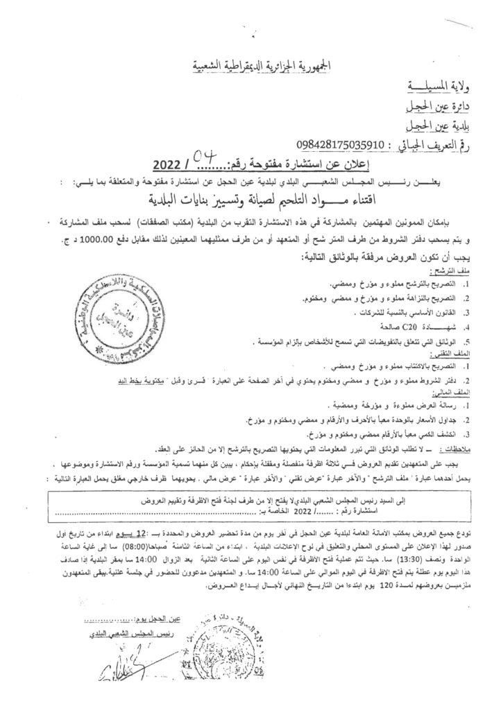 إعلان عن استشارة مفتوحة 2022/04: اقتناء مواد التلحيم لصيانة وتسيير بنايات البلدية / بلدية عين الحجل