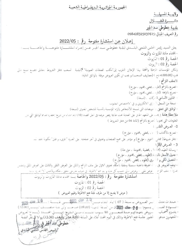إعلان عن استشارة مفتوحة 2022/05: إقتناء مادة المازوت والزيوت / بلدية خطوطي سد الجير