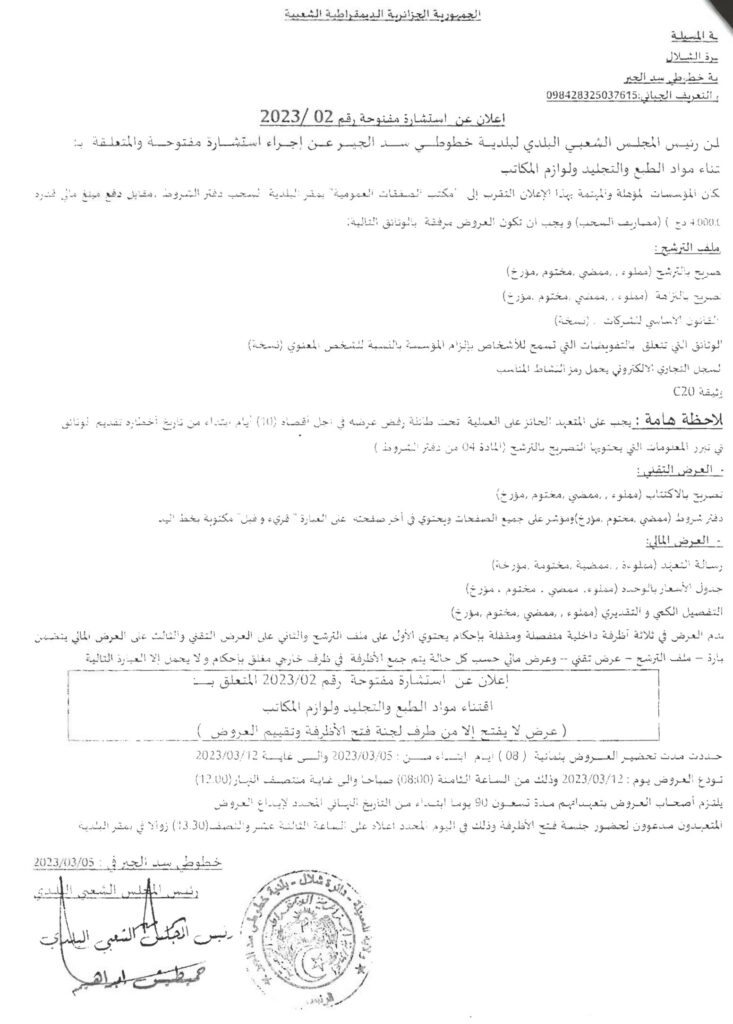 استشارة مفتوحة والمتعلقة بـ : اقتناء مواد الطبع والتجليد ولوازم المكاتب8 مارس، 20230 3 شاركها فيسبوك X مشاركة عبر البريد طباعة