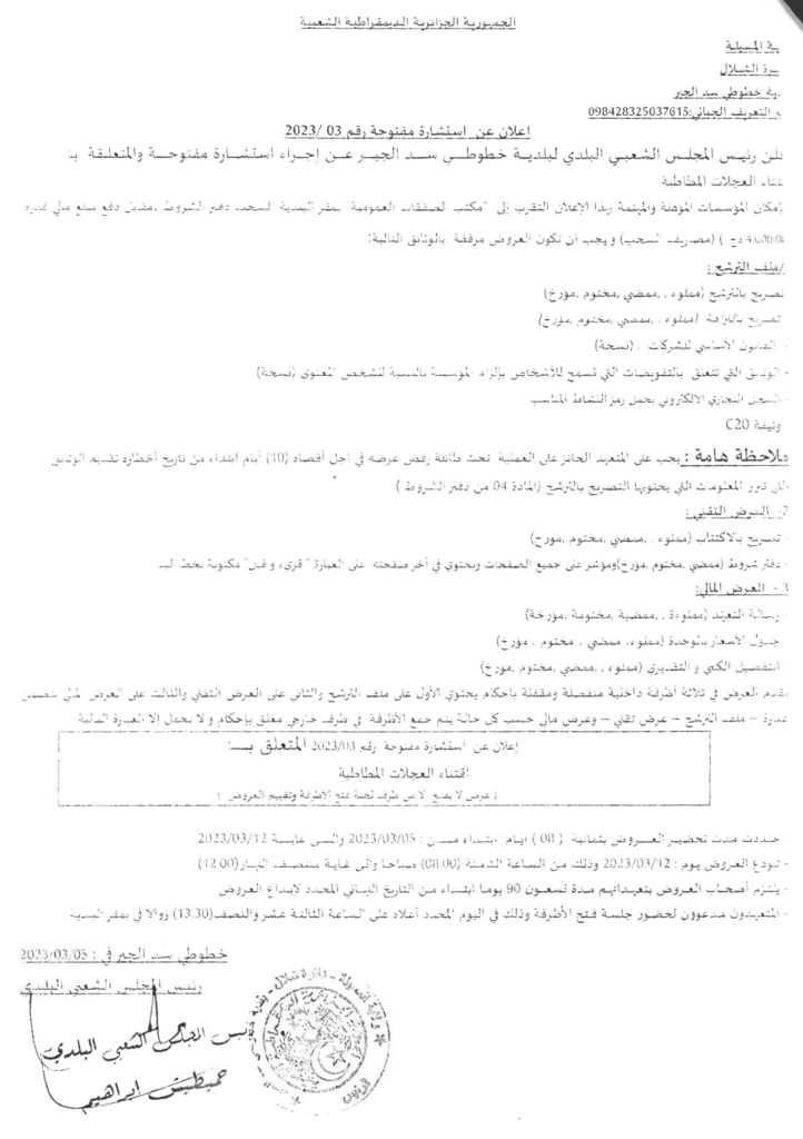 استشارة مفتوحة والمتعلقة بـ : اقتناء العجلات المطاطية8 مارس، 20230 6 شاركها فيسبوك X مشاركة عبر البريد طباعة