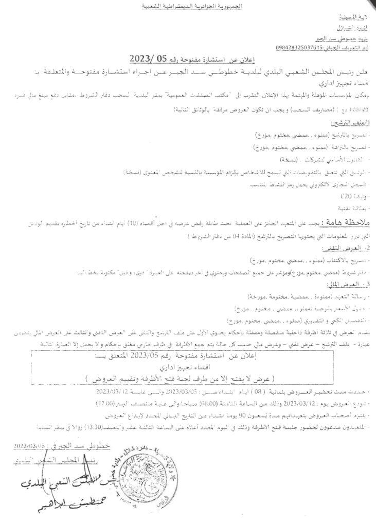 استشارة مفتوحة والمتعلقة بـ : اقتناء تجهيز اداري8 مارس، 20230 9 شاركها فيسبوك X مشاركة عبر البريد طباعة