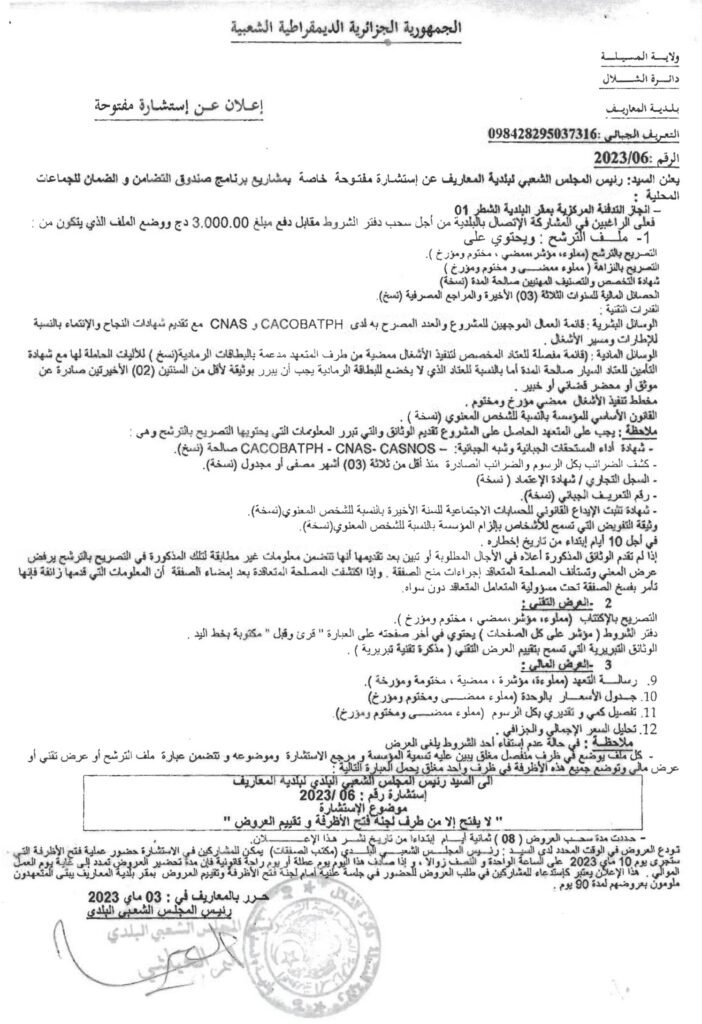 إعلان عن استشارة مفتوحة 2023/06 انجاز التدفئة المركزية بمقر البلدية الشطر الأول بلدية المعاريف