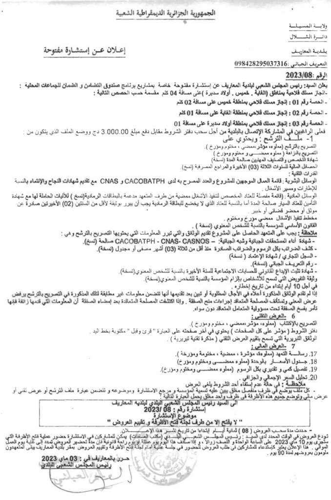 إعلان عن استشارة مفتوحة 2023/08 انجاز مسالك فلاحية بمناطق (الغابة، خميس، أولاد سديرة) على مسافة 04 كلم بلدية المعاريف