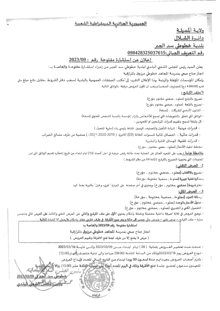 استشارة مفتوحة والخاصة بـ : انجاز جناح صحي بمدرسة المجاهد خطوطي مرزوق بالمزارقية12 مارس، 20230 8 شاركها فيسبوك X مشاركة عبر البريد طباعة