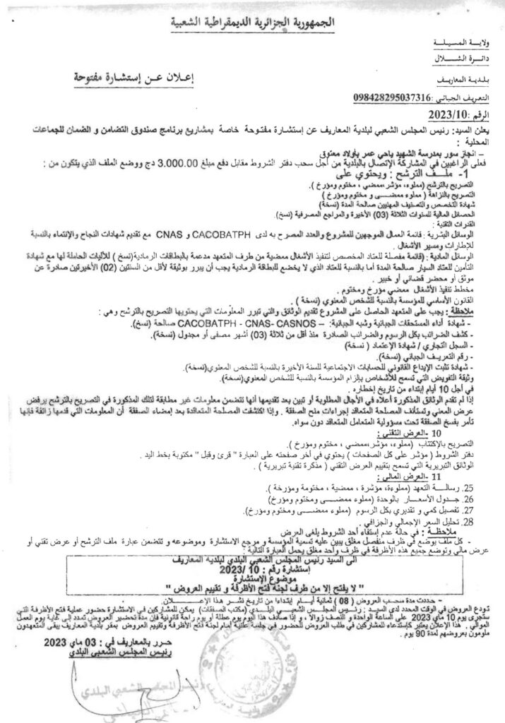 إعلان عن استشارة مفتوحة 2023/10 انجاز سور بمدرسة الشهيد ياحي عمر بأولاد معتوق بلدية المعاريف