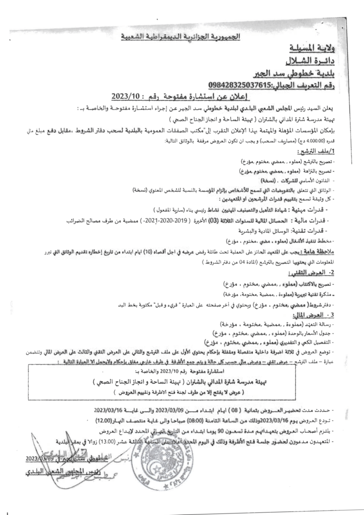 استشارة مفتوحة والخاصة بــ : تهيئة مدرسة شترة المداني بالشتران (تهيئة الساحة وانجاز الجناح الصحي)12 مارس، 20230 4 شاركها فيسبوك X مشاركة عبر البريد طباعة