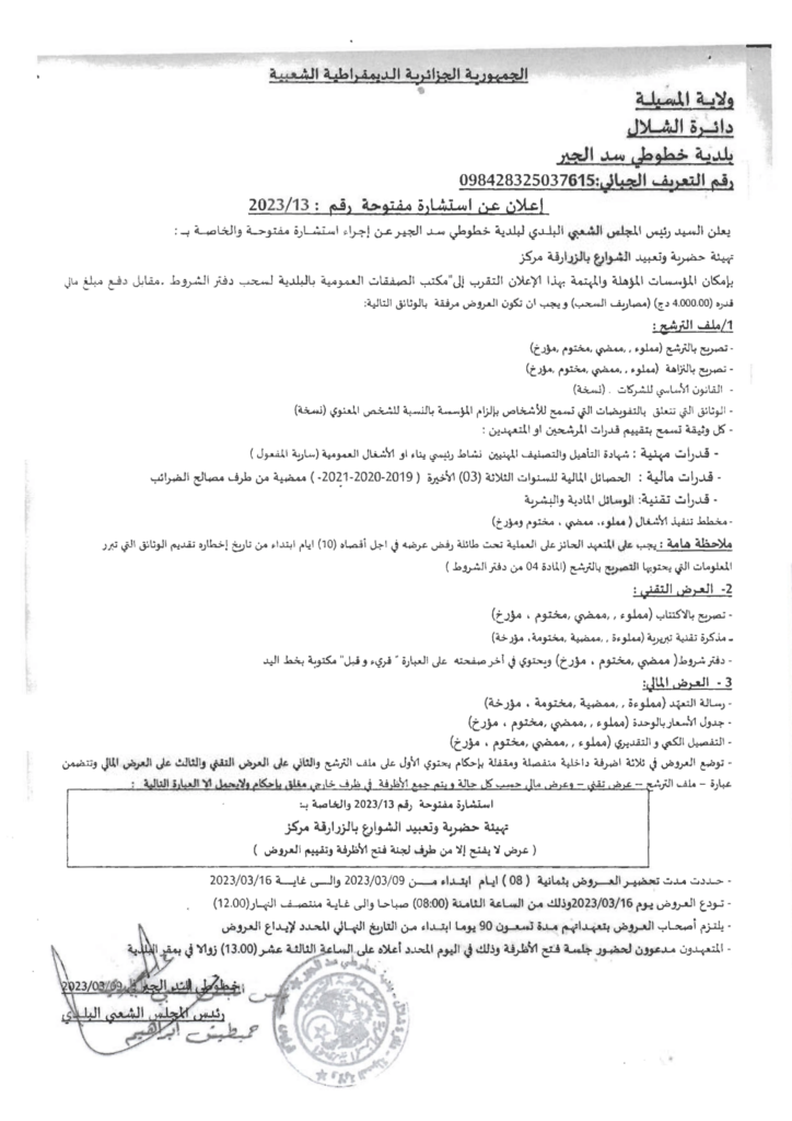 استشارة مفتوحة والخاصة بـ : تهيئة حضرية وتعبيد الشوارع بالزرارقة مركز12 مارس، 20230 7 شاركها فيسبوك X مشاركة عبر البريد طباعة