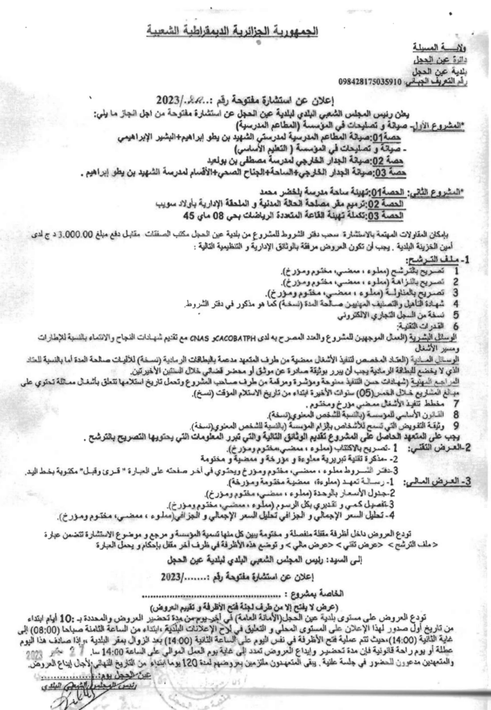 استشارة مفتوحة من أجل انجاز ما يلي: صيانة وتصليحات في المؤسسة (المطاعم المدرسية)1 أكتوبر، 20230 4 شاركها فيسبوك X مشاركة عبر البريد طباعة