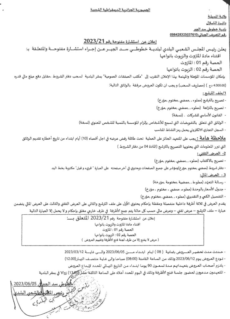 استشارة مفتوحة والمتعلقة بـ : اقتناء مادة المازوت والزيوت بأنواعها11 يونيو، 20230 0 شاركها فيسبوك X مشاركة عبر البريد طباعة
