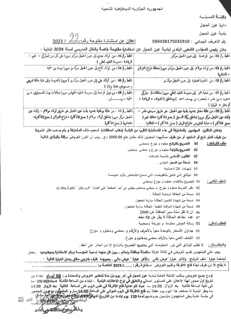 استشارة مفتوحة خاصة بالنقل المدرسي لسنة 202416 أكتوبر، 20230 12 شاركها فيسبوك X مشاركة عبر البريد طباعة