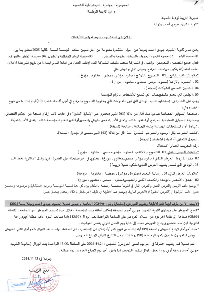 استشارة من أجل: تموين مطعم المؤسسة للسنة المالية 202413 نوفمبر، 20240 1 شاركها فيسبوك X مشاركة عبر البريد طباعة