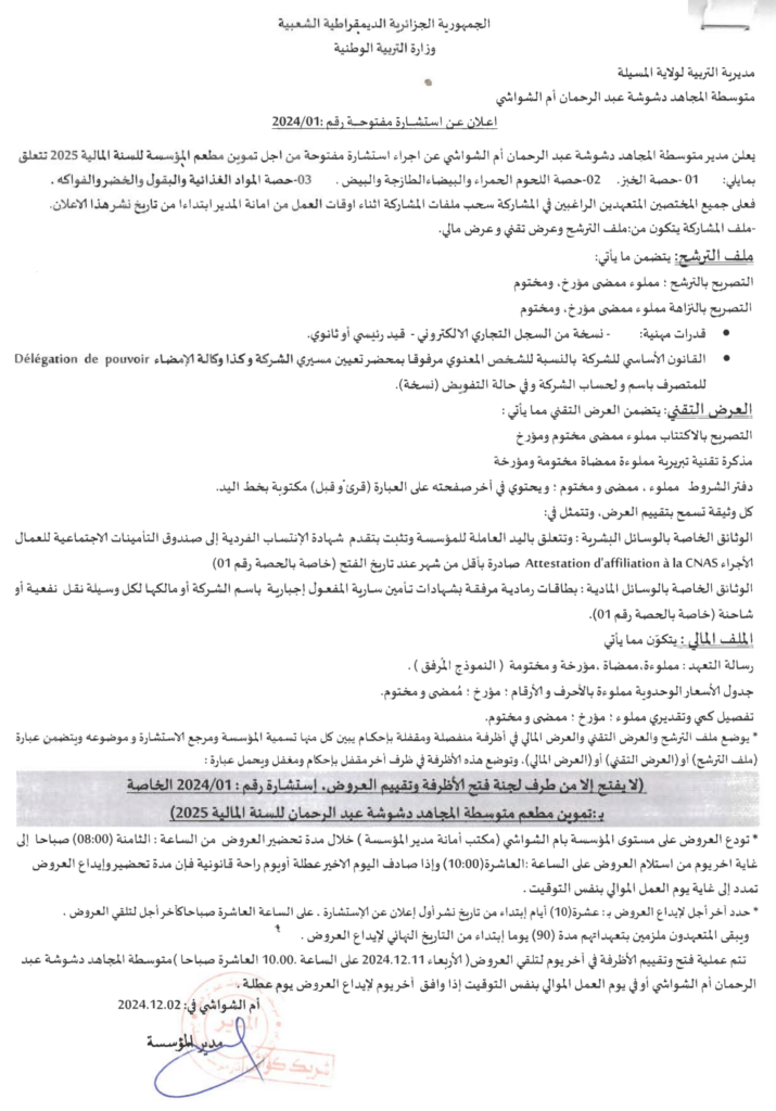 استشارة من أجل: تموين مطعم المؤسسة للسنة المالية 20252 ديسمبر، 20240 5 شاركها فيسبوك X مشاركة عبر البريد طباعة