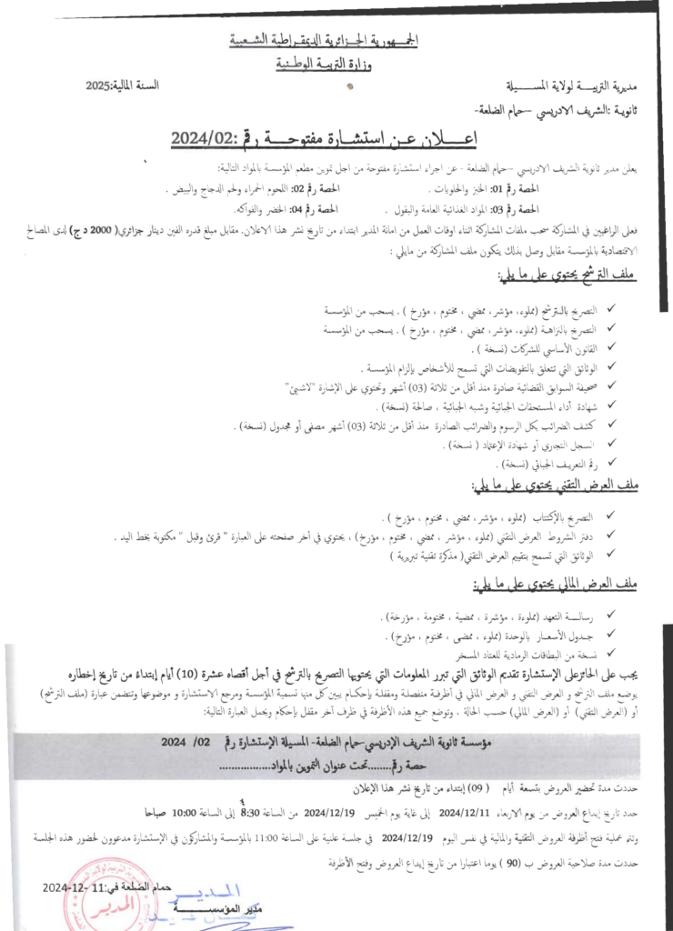 إعلان عن استشارة مفتوحة 2024/02 ثانوية الشريف الادريسي -حمام الضلعة-