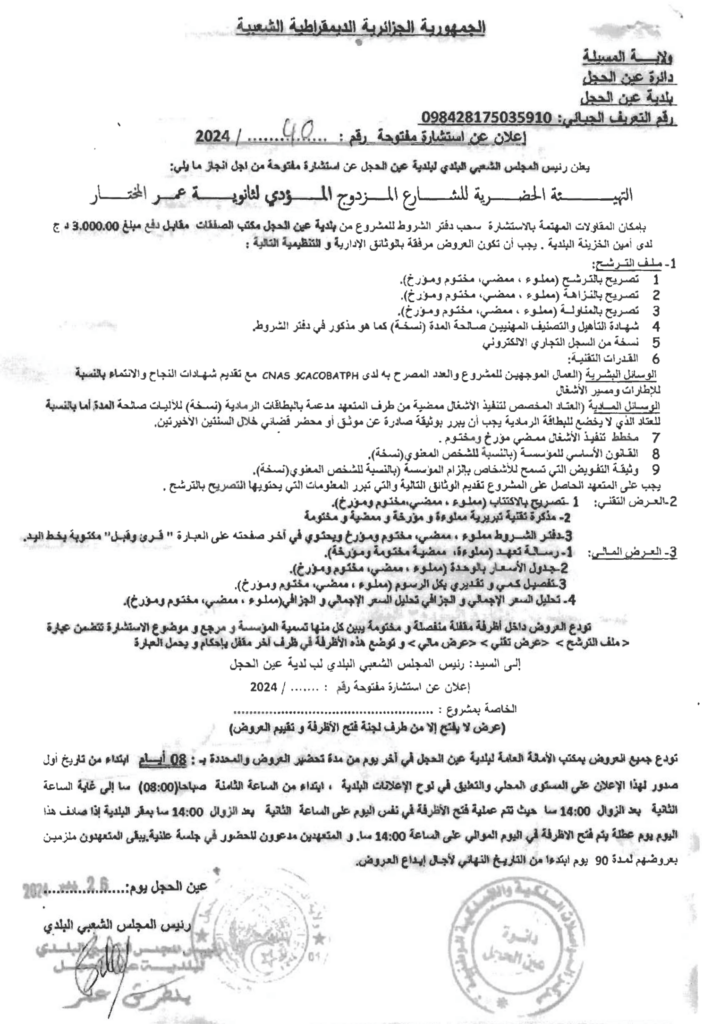 استشارة من أجل: التهيئة الحضرية للشارع المزدوج المؤدي لثانوية عمر المختار2 ديسمبر، 20240 6 شاركها فيسبوك X مشاركة عبر البريد طباعة