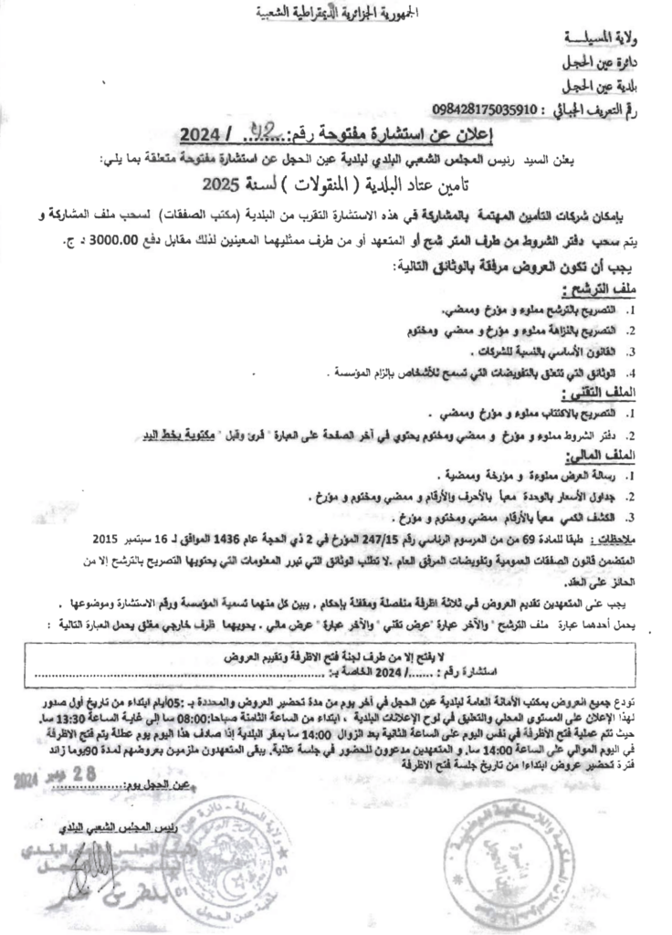 استشارة من أجل: تأمين عتاد البلدية (المنقولات) لسنة 20252 ديسمبر، 20240 1 شاركها فيسبوك X مشاركة عبر البريد طباعة