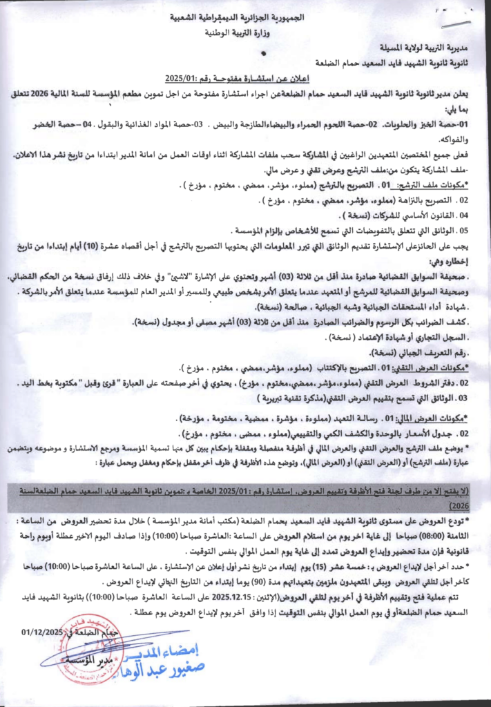 إعلان عن استشارة مفتوحة 2025/01 ثانوية الشهيد فايد السعيد حمام الضلعة