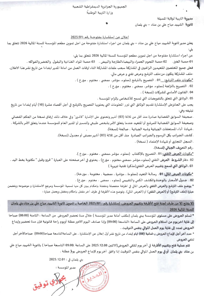 إعلان عن استشارة مفتوحة 2025/01 ثانوية الشهيد مباح علي بن مناد بني يلمان