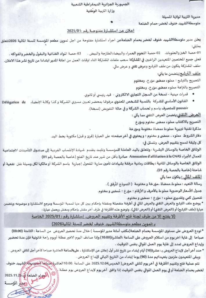 إعلان عن استشارة مفتوحة 2025/01 متوسطة الشهيد خنوف لخضر حمام الضلعة