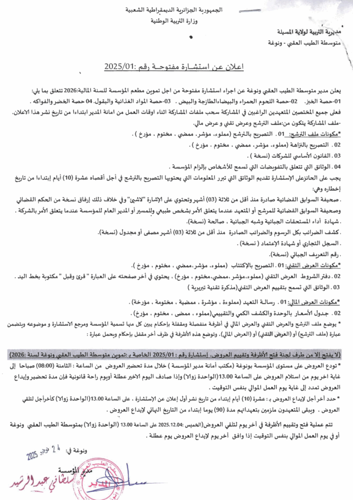إعلان عن استشارة مفتوحة 2025/01 متوسطة الطيب العقبي ونوغة