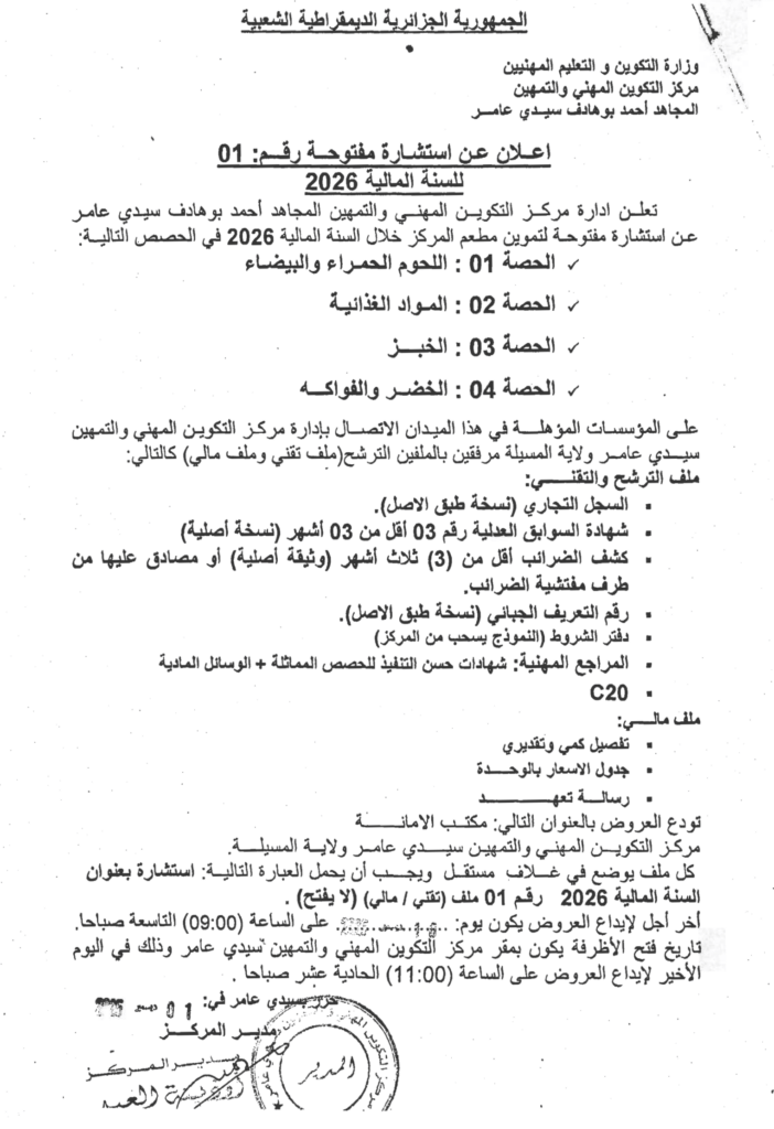 إعلان عن استشارة مفتوحة 2025/01 مركز التكوين المهني والتمهين سيدي عامر