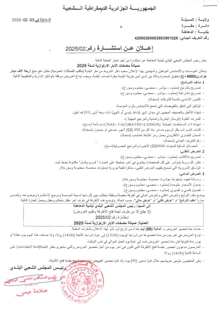 استشارة من أجل: صيانة مضخات الآبار الارتوتزية لسنة 20253 فبراير، 20250 3 شاركها فيسبوك X مشاركة عبر البريد طباعة