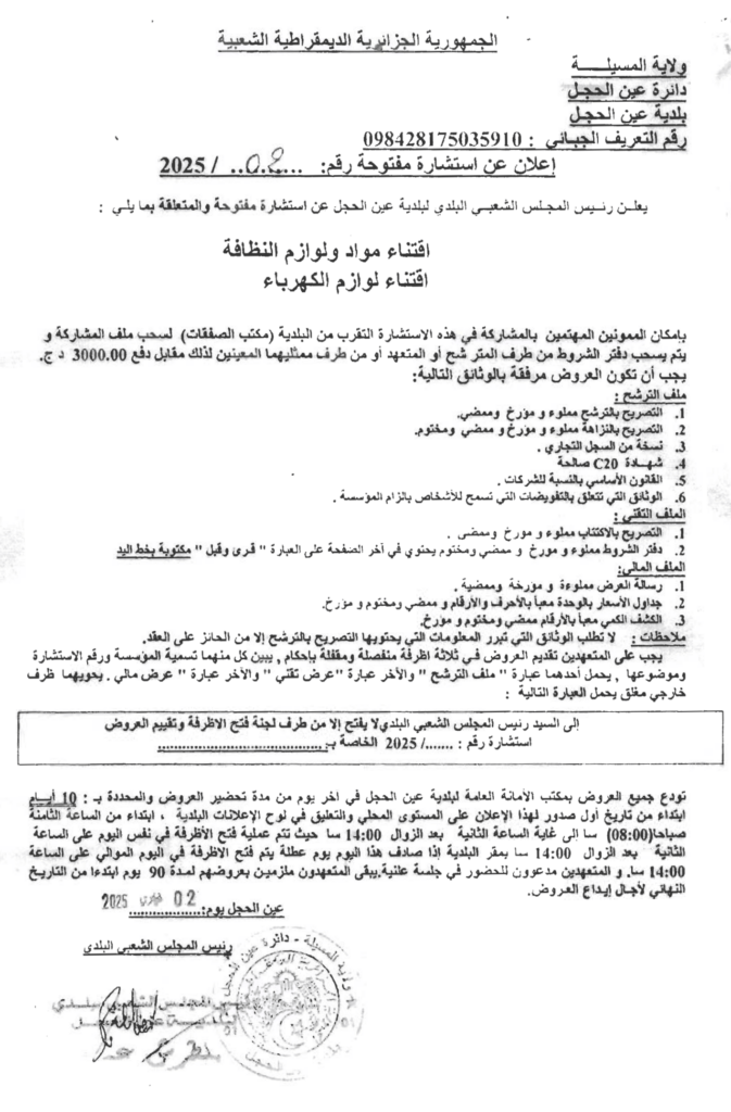 استشارة من أجل: اقتناء مواد ولوازم النظافة -اقتناء لوازم الكهرباء 6 فبراير، 20250 18 شاركها فيسبوك X مشاركة عبر البريد طباعة
